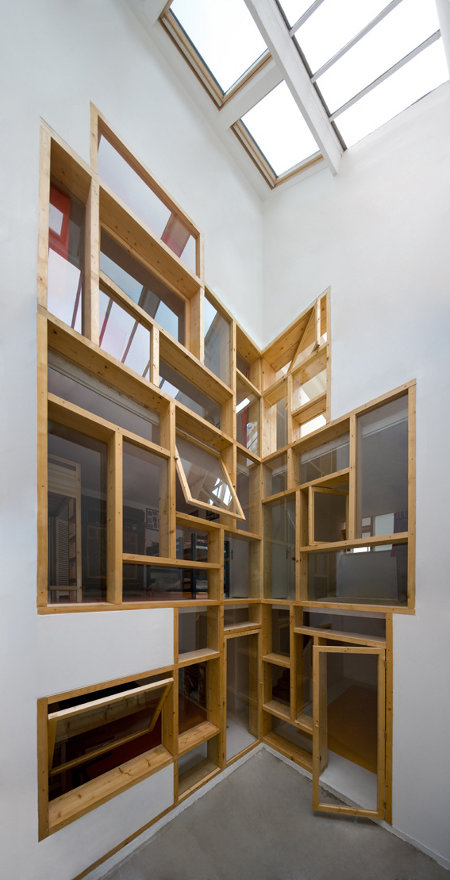 “Cette nouvelle construction est une véritable maison dans la maison. C’est un amoncellement de grandes fenêtres épaisses en pin, dont les nus de vitrages, le traitement des verres, les proportions variées et les ouvertures basculantes, pivotantes ou à frappe, permettent de multiples aménagements: rangements, bibliothèque, bureau ou simple fenêtre. Les vitres reflètent le soleil capté par la verrière et l’amène au pied du jardin d’hiver.”