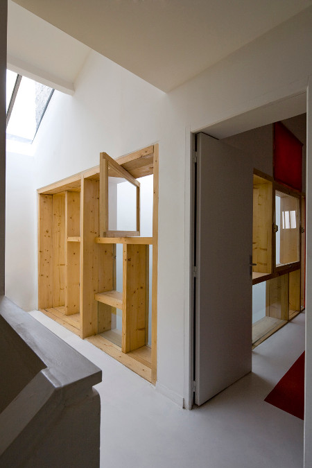 L’unité formelle apportée par l’objet créé par l’agence (le grand mur) ne rime par ailleurs par avec monotonie: selon les pièces où l’on se trouve, comme le montrent les photos, cette grande cloison est perçue différemment.
