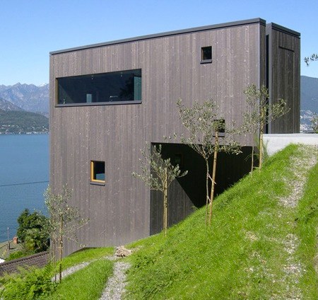 Installée à flanc de montagne, en bord de lac, cette maison s’inscrit dans la pente et s’élève sur deux niveaux, l’entrée se faisant par l’étage. Elle propose une décoration intérieure dépouillée, réduite à son plus simple appareil, utilisant un matériau quasi unique (du bois teinté en gris).