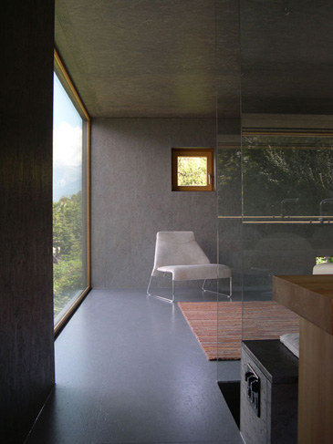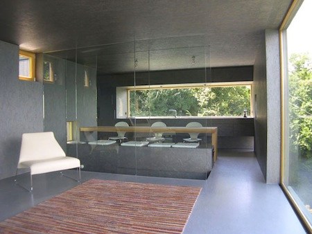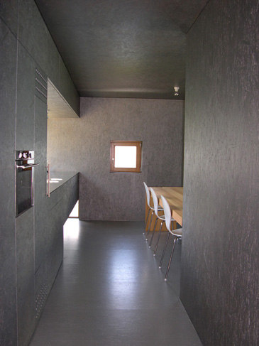 Il faut un certain culot pour réussir à convaincre des clients d’opter pour un aménagement intérieur uniformément gris foncé. Or, lorsque l’on voit le résultat, on comprend que cela en valait la peine: les espaces intérieurs sont élégants, presque sophistiqués alors qu’ils sont totalement dépouillés… Le peu d’objets présents s’en trouve d’autant mis en valeur, et semble presque “rayonner”.