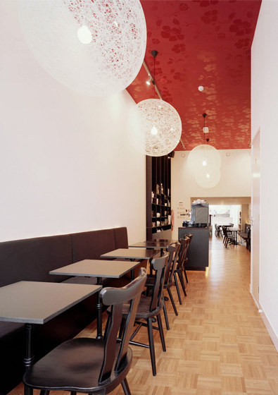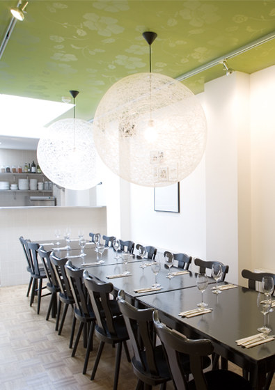 Le concept clair et lisible des architectes nous a séduit: on voit bien qu’en utilisant des meubles, des luminaires et des couleurs de murs identiques, ils sont cependant parvenus à créer des pièces bien différentes les unes des autres, en intervenant uniquement sur la hauteur des plafonds et en ne “colorant” qu’un seul des éléments (mur ou plafond). Il en résulte trois petites zones élégantes, qui parviennent à rompre la monotonie de l’espace tout en longueur du restaurant.