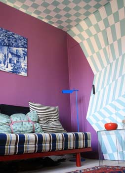 J’ai vécu dans un tout petit appart de 35 m2, il était tout blanc. Je sais que la couleur est parfois nécessaire contrairement à ce qu’on pense, mais si j’avais reproduit les couleurs et les motifs du studio ci dessus, je me serais sentie oppressée, et claustro. Cela n’enlève rien au talent de l’architecte!