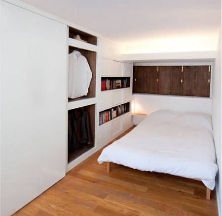 Réalisé par la jeune agence anglaise Alma-Nac, ce projet de réaménagement de chambre, perché sur une mezzanine, propose un paravent et divers aménagements modulaires, permettant de cloisonner plus ou moins l’espace.