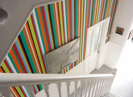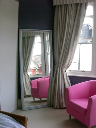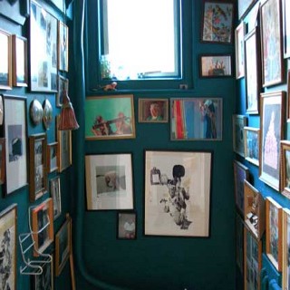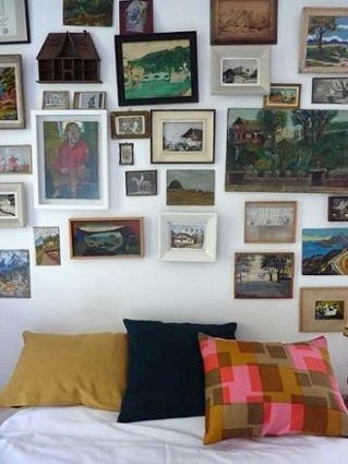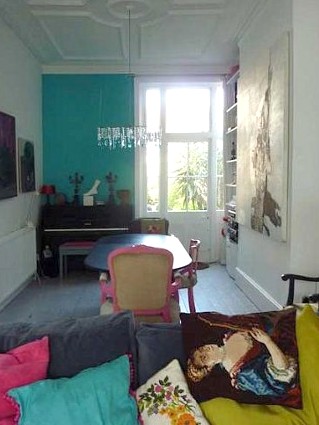 En effet, souvent, la couleur ou le motif viennent par touches. Ils sont localisés à des endroits précis, et ainsi d’autant mis en valeur. C’est vrai pour les murs remplis de cadres, pour les coussins qui sont accumulés ou placés ici ou là, et qui apportent des ponctuations colorées. C’est aussi vrai pour le mur “arc en ciel”, pour la lampe colorée dans la chambre à coucher noire…: à chaque fois, on sent bien que c’est le contraste, et donc la mise en valeur, qui était recherchée.