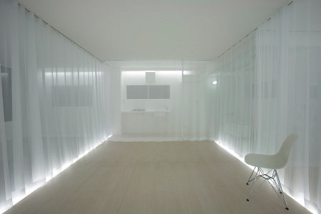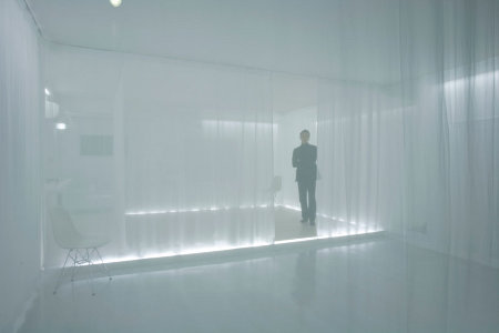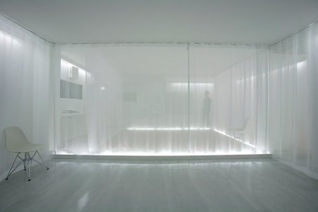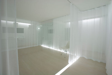 Ceci étant dit, le système modulable de rideaux et de voilages souples et translucides, tel qu’il a été mis en place, est extrêmement séduisant et intéressant. Il permet de créer des opacités progressives, tout en apportant de la lumière à l’intérieur de cet espace tout en longueur et peu ouvert sur l’extérieur. C’est cela qui nous a principalement intéressé, ainsi que les éclairages encastrés dans le sol et le plafond qui apportent à ces cloisons souples encore plus de blancheur, et les faisant devenir presque magiques ou irréelles.