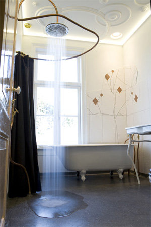 La pomme de douche, surdimensionnée, est directement connectée aux tuyaux d’eau chaude et d’eau froide.