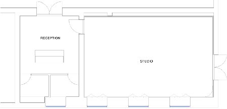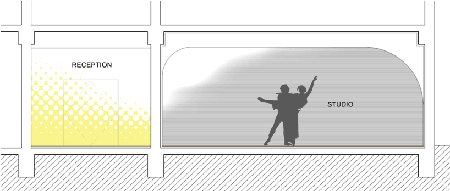 A l’inverse, le hall d’accueil arbore des formes et couleurs vives: de gros rond jaunes envahissent les murs, rappelant la trame de la salle de danse, dans une version surdimensionnée.