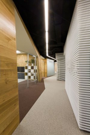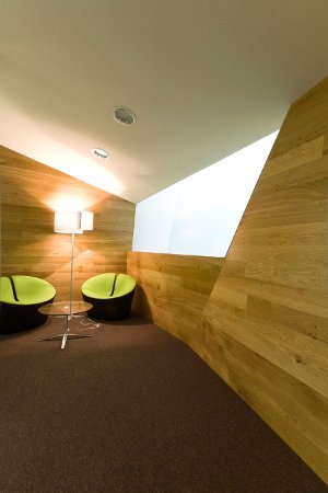 La hauteur sous plafond, relativement faible (3,6m), a été compensée par une utilisation particulière de la couleur (foncée en haut et plus claire en bas), et par une palette de matériaux spécifique et contrastée, associant notamment bois et liège.
