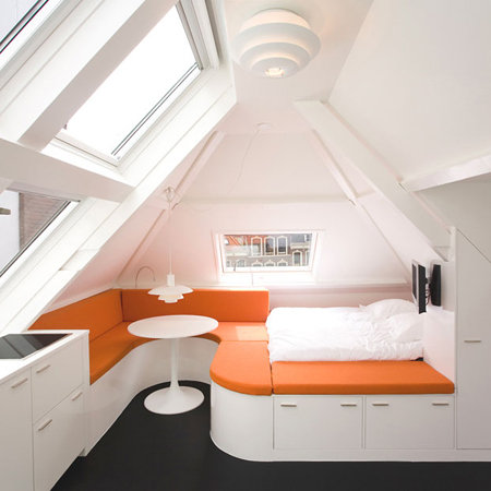 On remarquera également la place spécifique qui est attribuée au lit, perché, et qui apparait comme une extension de la Banquette.