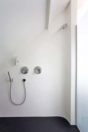 Ce sentiment d’espace provient essentiellement du concept d’aménagement et de décoration intérieure mis en place, privilégiant le mobilier intégré et les formes courbes. L’utilisation particulière de la couleur (murs entièrement blancs, sol uniformément foncé gris anthracite, et “bande” orange qui vient dynamiser l’espace) participe également à l’identité si particulière de ce logement.