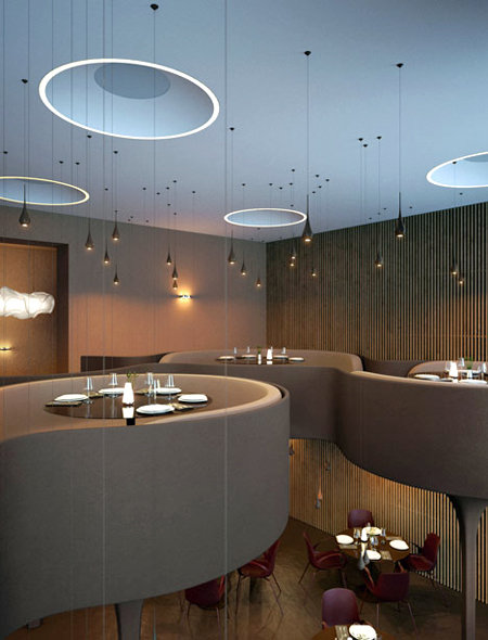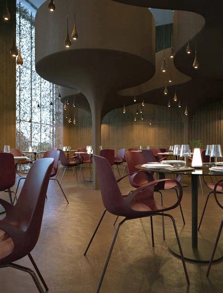 La salle à manger s’inspire directement de deux phénomènes naturels: les tornades et la pluie. L’espace est doté de six balcons suspendus, dont le pied rappelle la forme d’une tornade. Les murs sont doublés de lattes verticales en bois, claires, qui rythment l’espace et créent un contraste avec les formes courbes, foncées et lisses des aménagements intérieurs. Un peu partout des lampes suspendues, en forme de goutte d’eau, évoquent la pluie qui tombe.