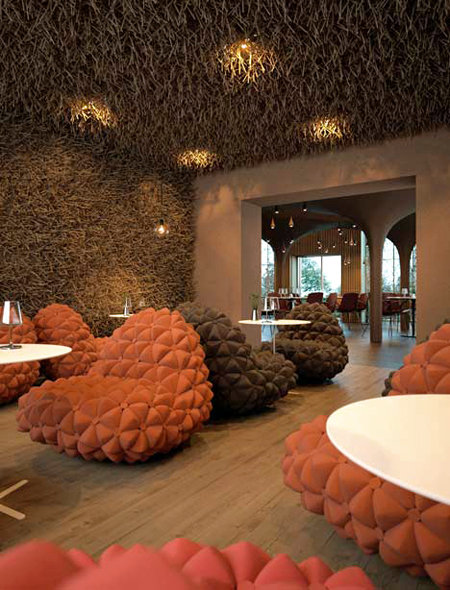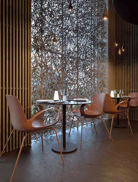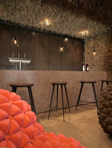 Le bar lounge, traité dans un esprit salon, est quant à lui fait à partir de baguettes en bois collées entre les unes aux autres. Cette décoration murale crée une sensation de nid d’oiseau, un espace dans lequel on se sent bien, chaleureux et confortable. Les fauteuils rappellent des pommes de pin, et le tout nous plonge dans une ambiance « nature » évoquant le calme d’une forêt après l’orage.