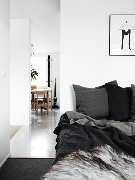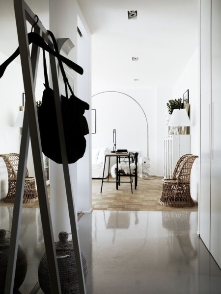 Cet appartement est très blanc, très simple, très épuré, très suédois quoi… Personnellement, nous aimons beaucoup la sérénité et le calme qui se dégage de ce type d’espaces, dans lesquels on se sent bien. Ce style se résume, en plus, en peu de “recettes” qui peuvent être facilement transposées: beaucoup de blanc (sur les murs, au sol ou au plafond), souvent un peu de gris (clair ou moyen, afin de créer une petite nuance par rapport au blanc), quelques éléments noirs et “graphiques” (mobilier, luminaires, accessoires, objets déco), et une place importante accordée aux matériaux naturels (bois, rotin, voire fourrure…), avec une préférence à ce sujet pour des objets ayant un peu déjà vécu. Pour pimenter le tout, placer ici ou là quelques touches de couleurs plus vives, et/ou des objets aux formes originales et inhabituelles, et/ou des végétaux (fleurs, plantes…).