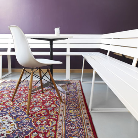 Nous avons aussi particulièrement apprécié la création des deux petites zones de dégustation, créées à partir de meubles identiques, mais mis en scène différemment: ici le banc est peint en blanc et là non, là on trouve un tapis d’orient et là non, etc.