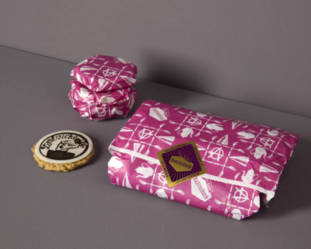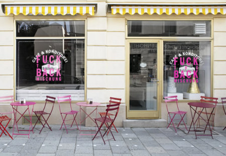 La boutique appartient à un ancien punk et membre actif de Greenpeace, qui s’est donné pour mission de revisiter la pâtisserie traditionnelle. Tout l’enjeu, pour l’agence Designliga, était de créer un design d’intérieur et une identité visuelle complète pour le lieu, qui à la fois préserve la culture culinaire et la tradition de confiserie de la région, et en même temps qui revendique une certaine modernité et un esprit volontairement décalé. Ce dernier va d’ailleurs jusqu’au nom de l’établissement: “Fuck the Backmischung” (Fuck le mélange à gâteau).