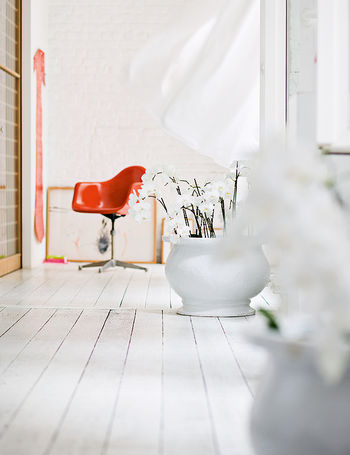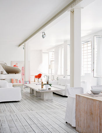 Sur les murs, les briques, lorsqu’il y en a, sont elles aussi peintes en blanc.