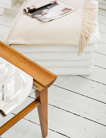 Dans chaque pièce, de grandes fenêtres laissent pénétrer la lumière naturelle. De simples voilages blancs viennent occulter les fenêtres, ce qui participe à la qualité de la lumière et de l’ambiance intérieure. Au sol, un plancher de bois lavés et teints en blanc apporte une certaine matérialité à l’espace