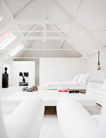 La chambre à coucher, tout aussi blanche, se situe sous la charpente. Bien que vaste, elle évoque presque un nid, ou un nuage. Bien qu’elle ne soit éclairée que par le toit, la chambre est lumineuse et très claire, et ne donne pas l’impression d’un espace qui serait « prisonnier » sous les combles.