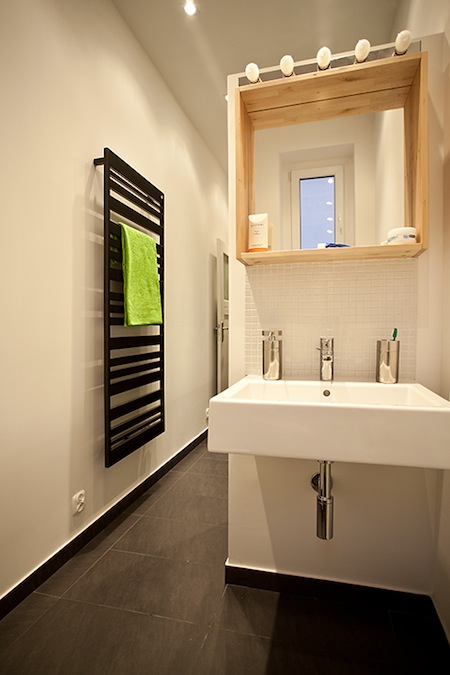 - Dans chaque pièce, vous remarquerez aussi quelques éléments ou meubles laissés en bois massifs ou en matériaux naturels, qui viennent un peu « réchauffer » l’espace.