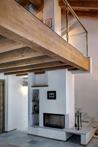 On remarquera la qualité des matériaux employés et des finitions apportées à cet espace. Nous avons également apprécié le soin apporté à quelques détails tels que le « tapis » en parquet placé sous les fauteuils du salon, qui lui confère un aspect chaleureux en totale relation avec la cheminée qui est juste à présent, ou encore les aménagements sur-mesure réalisés dans la chambre à coucher.