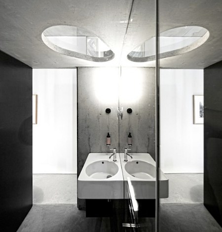 Sobre et élégante, la salle de bains présente comme un ensemble de matériaux bruts dont les couleurs s’échelonnent du blanc au noir. Au plafond, un puits de lumière apporte un peu de clarté à l’espace.