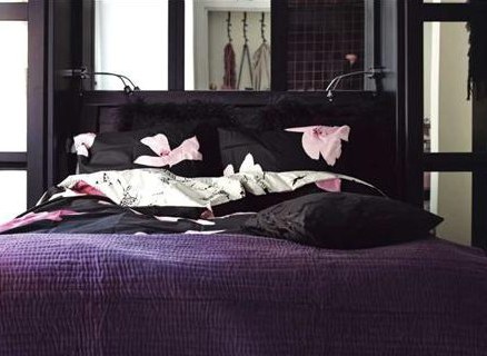 Le lit – espace nuit, qui se déplie depuis le mur de miroirs, se décline lui aussi dans les couleurs foncées utilisées dans le reste de la décoration.