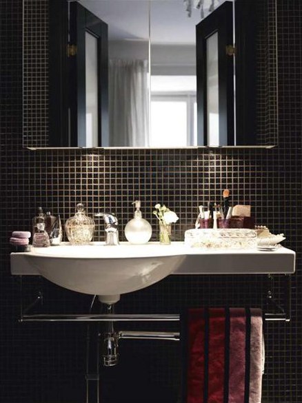 La décoration intérieure propose notamment sur un grand mur de miroirs qui non seulement agrandi visuellement la pièce, mais dissimule également des rangements intégrés. L’ensemble des fonctions (salle de bains, cuisine, armoires…) sont par ailleurs situées en périphérie de l’appartement, afin de laisser un maximum d’espace central libre. Au niveau des couleurs, on a misé sur des contrastes forts et présents, et on a osé des couleurs assez sombres qui peuvent paraître inhabituelle dans un petit appartement, mais qui confère ici au lieu une identité particulière, et qui lui apportent également un certain « chic« .