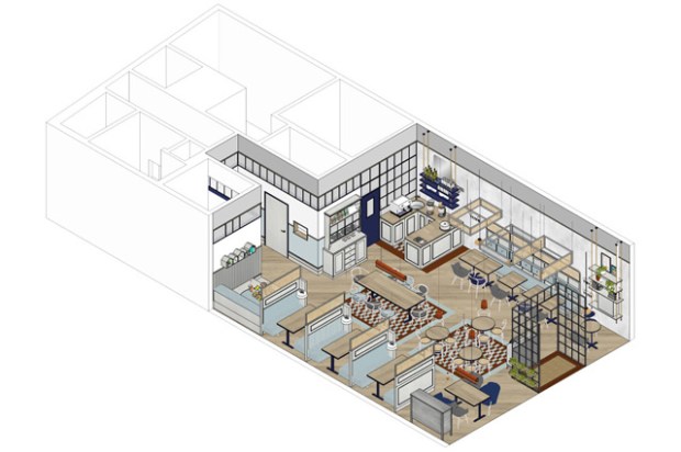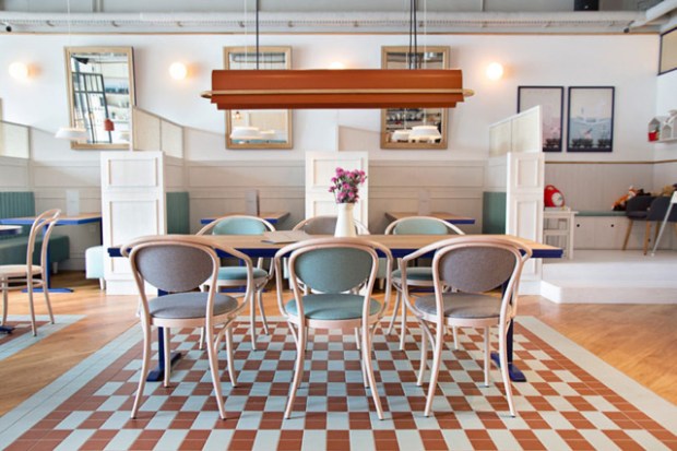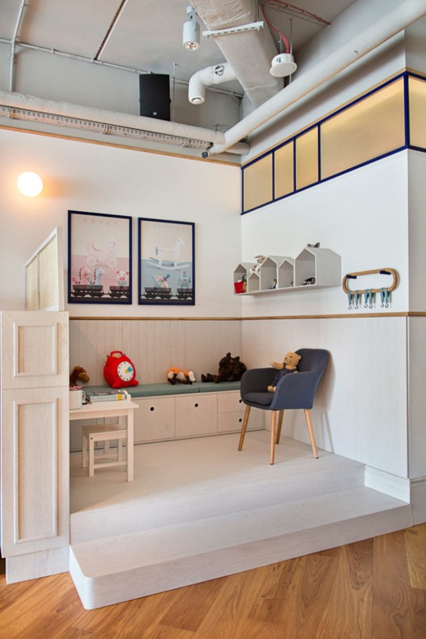 Ces différentes zones sont matérialisées par un traitement spécifique au sol. Si l’on retrouve du parquet de bois clair dans l’ensemble de la pièce, on notera un grand rectangle carrelé qui vient matérialiser l’effet salle à manger de la grande table centrale. D’autre part, dans le registre des bonnes idées, en voilà une qui devrait séduire de nombreux restaurateurs, la présence d’un coin enfants, pour que ces derniers puissent s’amuser pendant que les adultes profitent sereinement de leur repas.