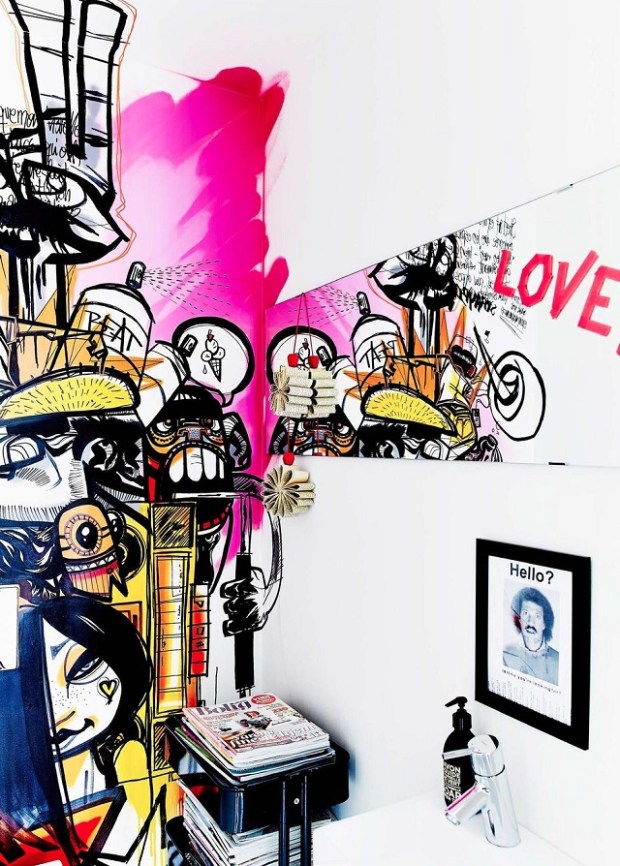 Les propriétaires ont été jusqu’à contacter un groupe de street artists locaux et leur donner carte blanche sur un mur et la baignoire. Sur le plan du mobilier, on retrouve cet esprit très ludique, une table basse sur roulette faite en palettes, un banc provenant d’une caserne de pompier pour se déchausser dans l’entrée, un mannequin récupéré dans une boutique et peint en jaune pour accueillir les bijoux de la maîtresse de maison…