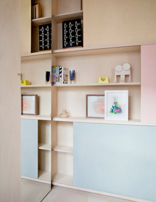 Travailler dans un si petit espace pour le rendre vivable et (c’est sans doute aussi important) agréable est un véritable tour de force réussi par ce couple. L’idée même de s’inspirer d’intérieurs nomades comme ceux d’une caravane ou d’un bateau. L’aspect pratique a été pensé dans ses moindres détails, avec des astuces dans tous les recoins. Le fait que tout puisse disparaître dans les caissons sur mesure permet de renforcer efficacement le sentiment d’espace, sans renier sur le confort et les équipements. On trouve ici tout ce qu’il faut pour vivre, et ce uniquement lorsque l’on en a besoin. L’utilisation d’un matériau dominant et répété pour le plancher, les murs et le plafond donnent un agréable impression de « tout ». Un cocon de bois très clair rehaussé par les tons pastels des armoires et de petits coussins. En plaçant de grands miroirs de part et d’autres de la pièce, le couple parvient à étirer les lignes de l’appartement et de donner cette sensation d’espace si importante lorsque l’on a que 13 m². Dans le coin salle à manger, on apprécie l’astuce des petits rabats situés aux extrémités des bancs et qui permettent de disposer comme par magie de deux assises supplémentaires.