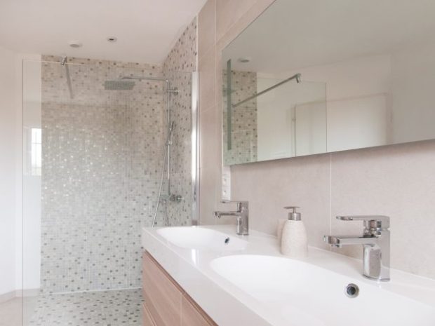 Mes clients souhaitaient rafraîchir la salle de bains principale de leur maison pour avoir une ambiance naturelle, relaxante, et contemporaine, tout en gardant l’agencement actuelle pour minimiser les frais. La solution est trouvée en apportant des matériaux et couleur aux teintes claires. Côté ambiance, place aux camaïeux de beige pour une unité de l’ensemble avec différente tailles se carrelage pour du dynamisme, pour l’espace de douche de la mosaïque à petits carreaux beige et gris argenté pour un effet lumineux, du bois clair pour les meubles et une peinture au sable. Crédit photos : Amélie Ferrand
