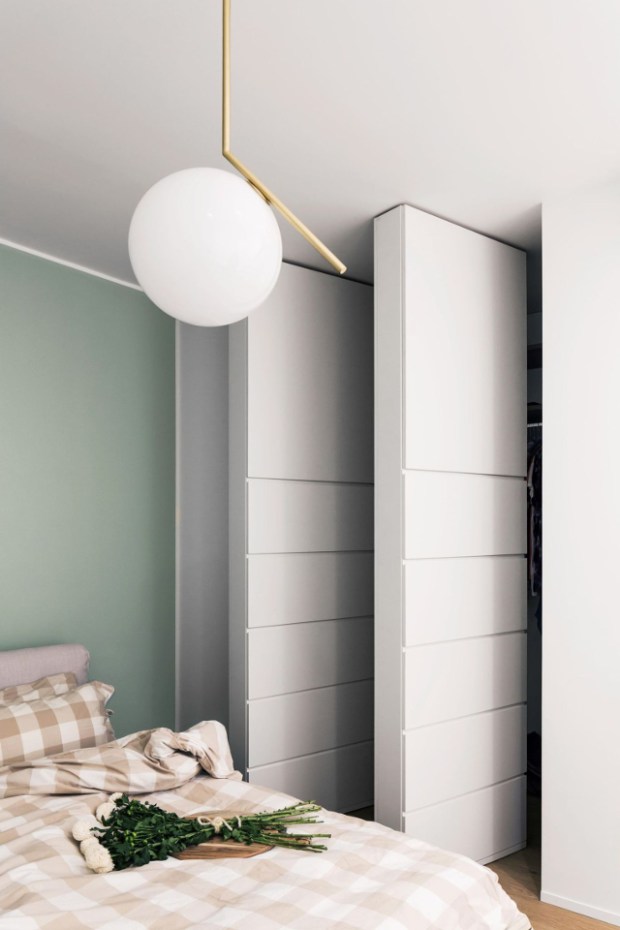 Du côté de la chambre c’est le grand dressing qui nous séduit. Ses portes pivotantes à 360 degrés laissent la lumière naturelle de s’infiltrer tout en étant très graphiques lorsque fermées. Le mobilier comme les murs sont tous peints en blanc dans la chambre, comme pour y apporter de la sérénité. Seul le mur de la tête de lit se pare de vert pour y apporter une touche dynamique.