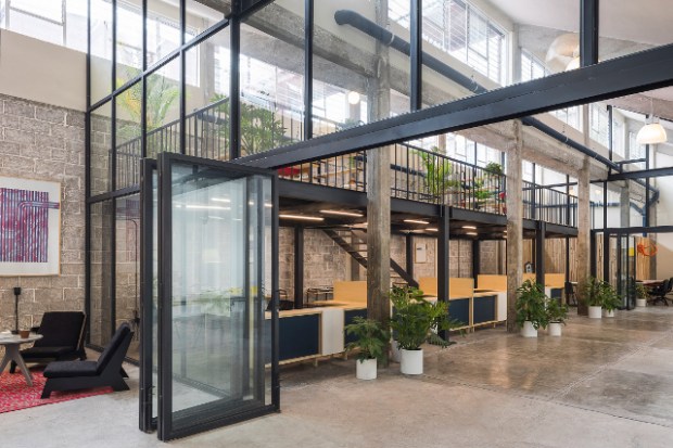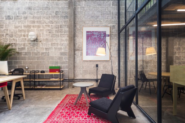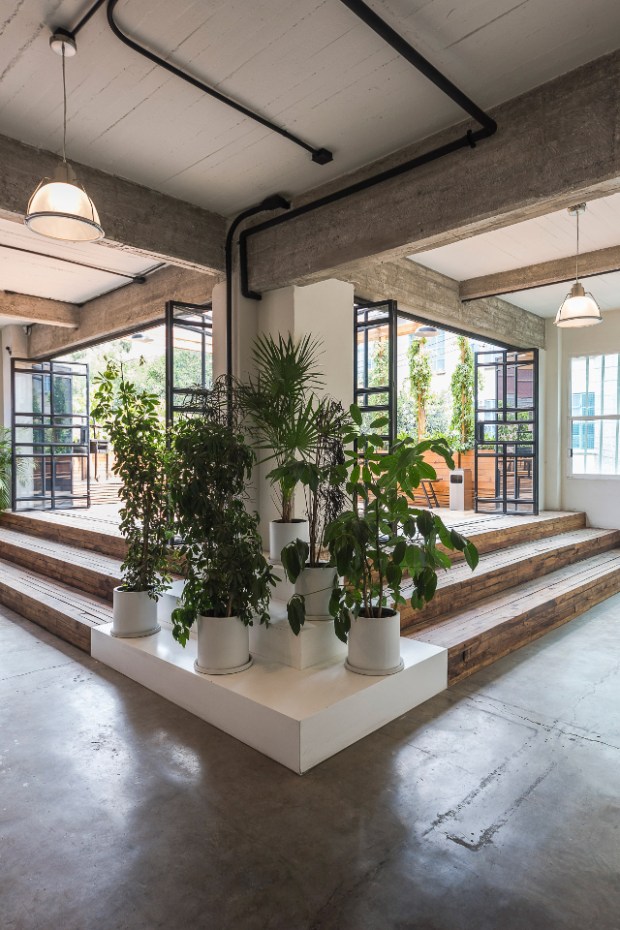 Bureaux, suspensions lumineuses et abondance de plante verte font de cet espace une zone de travail très agréable et fonctionnelle. « Ces quelques éléments font en sorte que la structure de construction d’origine joue un rôle de premier plan, les colonnes de béton visibles et les murs de ciment exposés contrastent avec le mobilier » expliquent les architectes. Ce grand volume fonctionne comme un atelier ouvert bordé de zone de travail plus intimes et cloisonnées. Une mezzanine est encastrée au point le plus élevé de l’atelier pour accueillir une zone de repos et de lecture.