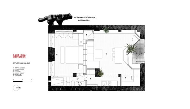 Le principal défi de ce projet était de composer avec le plafond extrêmement bas de la future habitation. Le second était la proximité de la façade de l’appartement avec la rue, puisque la porte d’entrée existante donnait directement sur la rue La solution proposée par les architectes a été de créer une sorte de petit vestibule pour amortir le bruit de la rue et permettre une transition vers l’appartement. L’astuce a été de faire de cet espace tampon une petite cour traitée comme un jardin. Au-delà de l’esthétique très réussie, elle a également l’avantage supplémentaire de laisser la lumière filtrer dans le studio. L’espace de transition a été matérialisé par une double porte, la première étant une simple tôle d’acier perforée et pliante, la seconde est une porte vitrée. Cette solution permet aux occupants de choisir de s’ouvrir sur la rue, ou au contraire de lover dans un cocon. A l’intérieur, le plan en deux parties est très simple. La première accueillant le salon, la salle à manger et un coin bureau donnant sur le jardinet, la seconde pour la chambre à coucher. Le défi n’était pas seulement de créer une décoration dans un espace réduit, mais surtout de composer avec ces plafonds très bas. Pour résoudre ce problème, les architectes ont utilisé une seule finition dans tout l’appartement : une résine époxy blanc. Cette astuce permet aux architectes de créer une surface continue et de renforcer le sentiment d’espace.