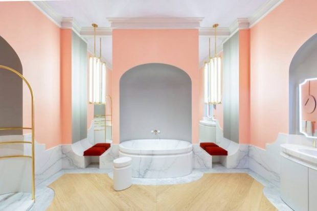 - Penser aux courbes dans le mobilier comme dans l’architecture (ici les alcôves) et les accessoires (les miroirs) pour adoucir un espace et le ainsi le rendre accueillant. C’est d’autant plus important dans le cadre d’une salle de bain qui est un lieu dédié au bien être.