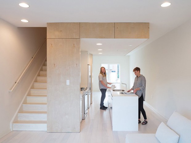 Les architectes et décorateurs d’Interface Studio Architects ont dessiné et aménagé une maison du centre de Philadelphie. Très étroite, l’habitation se dresse sur trois étages et est rythmée par un caisson de contreplaqué de bouleau qui s’élève sur toute la hauteur du bâtiment. Fonctionnelle et esthétique, cette solution semble idéale dans cette configuration et contraste élégamment le caractère épuré de la décoration. Ce que nous avons aimé et nos conseils déco juste après la visite en images :