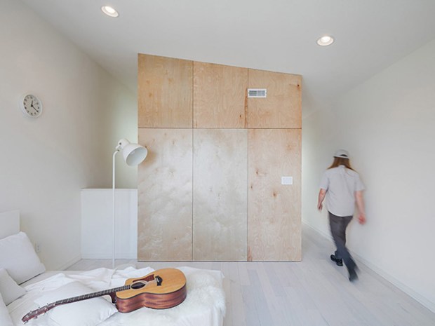 La très bonne idée d’ISA a été la conception d’une pièce centrale en contreplaqué de bouleau pour cette étroite maison de trois étages. Un véritable noyau intérieur qui dicte la mise en page de chaque étage. En plus d’offrir un soutien structurel, ces boites permettent aux architectes de dissimuler les fonctions de service, comme la cuisine, les salles de bains et les sanitaires. Les escaliers courent en s’enroulant autour de cette colonne vertébrale qui renferme par ailleurs de nombreux rangements.