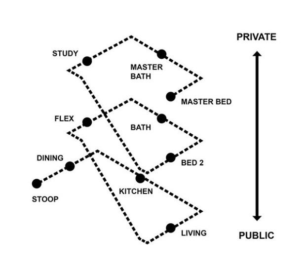 On apprécie particulièrement le plan de cette maison , qui comme le montre le plan des architectes et le croquis associé, déroule les zones de la plus commune à la plus privée au sommet.