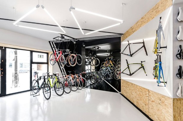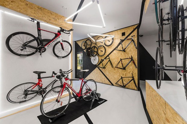 L’espace multifonctionnel qui peut accueillir les fonctions d’un magasin et d’un garage pour les réparations. Pour imaginer le lieu, les concepteurs se sont inspirés directement des vélos. Les formes triangulaires et les surfaces inclinées se réfèrent directement à la forme d’un cadre de bicyclette. Des formes que l’on retrouve directement peintes sur les murs, permettant de rythmer l’intérieur tout en orientant le regard du visiteur ainsi que les circulations.