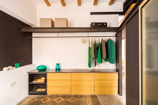 Les poutres en bois au plafond, les carreaux de ciment à motifs d’origine ont également été conservés – ceux qui étaient irréparables ont été remplacés par du neuf. Pour le reste de l’appartement, ce sont des aménagement sur mesure qui investissent l’espace, en chêne naturel ou peint en noir, ils assurent une belle continuité visuelle.