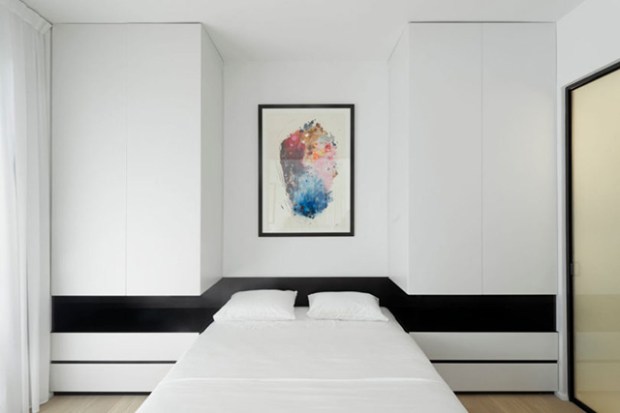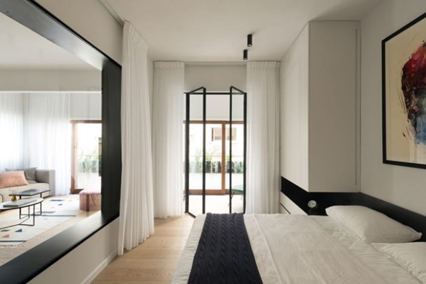 - L’idée de séparer la chambre à coucher de la pièce à vivre par une baie vitrée, voilà une très bonne solution pour ouvrir l’espace totalement, où il suffira de tirer un rideau pour obtenir de l’intimité, très malin !