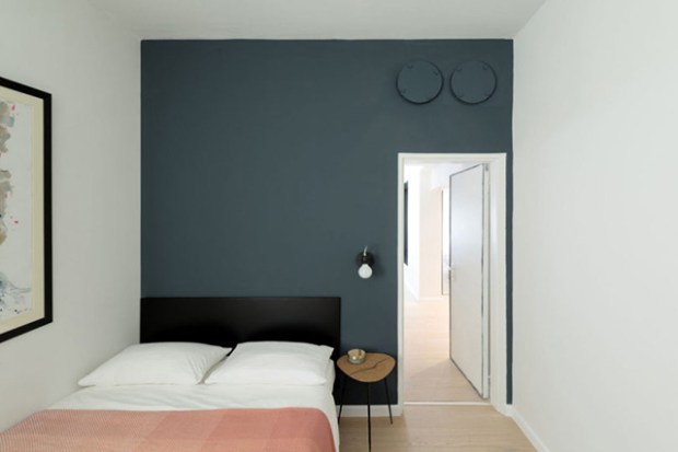 Si la carte du noir et blanc a sans aucun doute été jouée dans cette décoration, elle n’a malgré tout pas été poussée à l’extrême (comme dans ce projet par exemple). On se retrouve donc avec une belle dominance monochrome mais additionnée de couleurs traitées en aplat, comme dans la cuisine d’un bleu presque fumé. Un choix qui amène les différents volumes à dialoguer entre eux. D’autre éléments colorés viennent attirer le regard sans l’oppresser, quelques cadres renfermant des œuvres colorées et judicieusement disséminés jouent ce rôle à merveille.