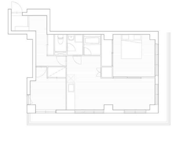 Au moment de repenser l’agencement et le circulations de l’appartement, les architectes ont fait le choix de marquer les différences entre les zones originales et les ajouts apportés par la rénovation. Ainsi, les poutres et le plafond de béton sont laissés brut, créant un contraste intéressant avec les murs blancs ou les cloisons de bois ajoutés. Il est aussi intéressant de constater qu’aucune des nouvelles cloisons ne s’élève jusqu’au plafond, laissant toujours un filet de lumière transpercer la claire-voie.