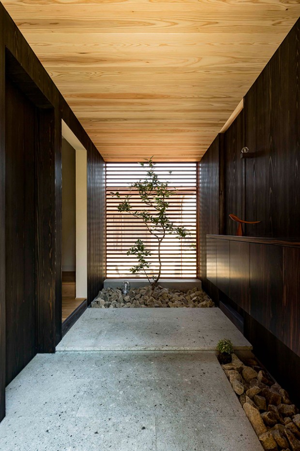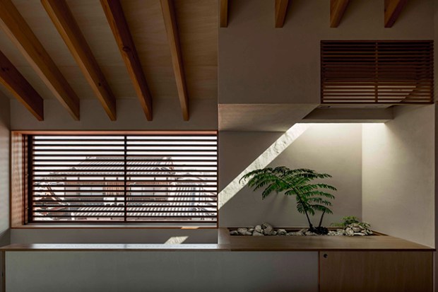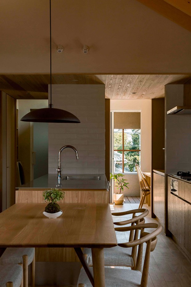 Connaissez vous le style : ‘Unagi No Nedoko’ ? Il s’agit d’un style d’architecture résidentielle japonaise caractérisé par des intérieurs longs et étroits, qui s’adaptent à la topographie du terrain et à l’urbanisation très dense du japon. Cette maison à Shiga a été conçue par Hearth Architects sur un terrain de seulement 5,5 mètres de large. Un format très difficile à travailler en architecture d’intérieur, notamment en raison du peu de lumière qui peut y circuler. Malgré ces contraintes, les architectes sont parvenus à condenser tout ce qui fait le style architectural japonais : la lumière, le minimalisme et la transparence. La première bonne idée dans ce type de logements étroits est de placer les pièces à vivre dans les zones les plus lumineuses. Ainsi, la cuisine, la salle à manger et le salon prennent place au sommet de la maison, les chambres nécessitant moins de lumière s’installent dans les étages inférieurs.
