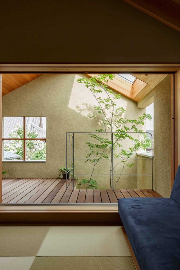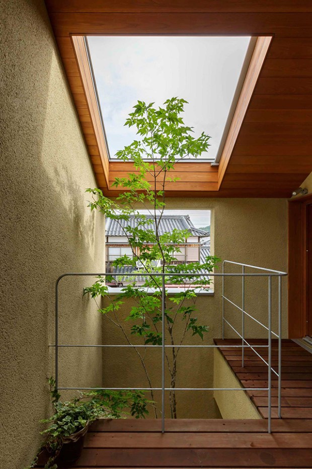 Une autre bonne idée lorsqu’un espace est étroit est de le connecter à l’extérieur, mais cette solution était impossible vu la nature de la construction. Les architectes ont donc amené l’extérieur à l’intérieur en plaçant des plantes et des arbres directement dans la maison ! Ils permettent non seulement une connexion à la nature, mais sont aussi utilisés pour combler les vides dans la maison, en particulier dans les zones à double hauteur. Ces hauteurs de plafond ouvertes, combinées à des puits de lumière, permettent aux arbres de se développer convenablement et naturellement .