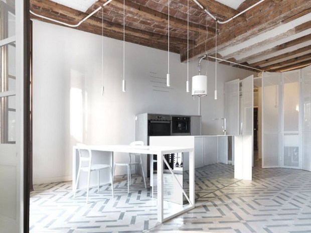 Sur le plan de la rénovation, les architectes n’ont pas pu conserver le sol d’origine trop endommagé, il ont donc installé des carreaux hydrauliques fabriqués à la main et assemblés dans un nouveau motif original qui crée un «tapis de carreaux» contemporain qui traverse l’espace. Lors de la rénovation, les architectes ont par ailleurs découverts des poutres d’origine qui ont été restaurées et apportent un côté chaleureux à l’appartement.