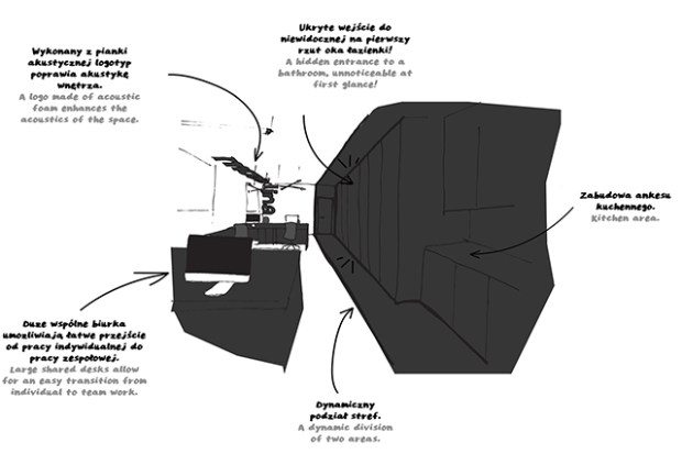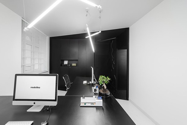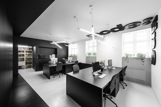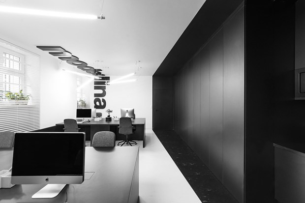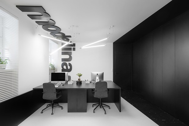 Les 90m² de ce bureaux d’architecture se dote de formes simples et minimalistes qui viennent définir les usages. On note une grande diagonale qui sépare l’espace en couleur. La zone blanche, lumineuse est réservée aux zones créatives où les collaborateurs sont amenés à travailler, tandis que la partie noir accueille les rangements, la cuisine, et les autres aménagement destinés au bien être des salariés. L’identité graphique du studio est aussi représentée par de grands logotypes placés au plafond et réalisés en mousse acoustique. Une solution pour améliorer le confort de l’équipe tout en marquant son identité. La majorité du mobilier a été fabriquée sur mesure, comme ces grands bureaux qui encouragent le travail collaboratifs et permettent de dissimuler tout câblage. Un impératif dans ces bureaux au style minimaliste très marqué. Concernant le système d’éclairage, les architectes ont créé des enchevêtrement de néons suspendus qui semblent former des motifs abstraits au plafond, une idée simple et très créative.
