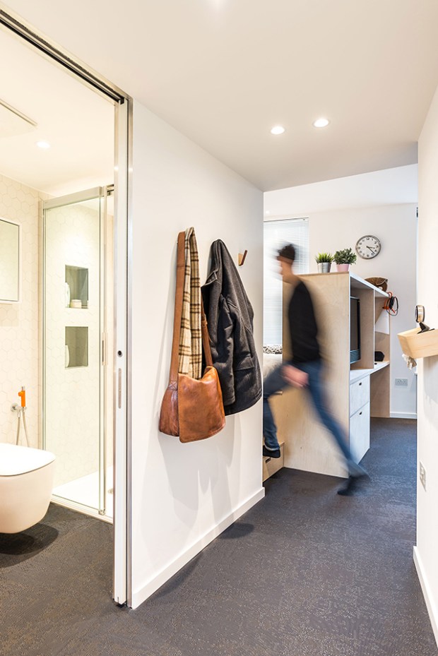 La salle de bain est prise en sandwich entre l’espace principal et la cuisine, et son accès se fait par une porte coulissante pour limiter les contraintes de débattement. CIAO a également profité des hauts plafonds de l’appartement en ajoutant une mezzanine sur la salle de bain et l’entrée. Cela fournit des espaces de stockage pour réduire l’encombrement.