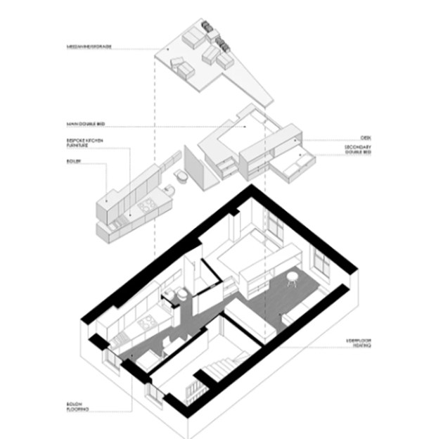 Revenons donc à ce projet qui prend place sur une surface de 35 m². Le client a demandé un réaménagement total de l’espace afin de pouvoir recevoir sa famille et ses amis, sans faire de compromis sur l’espace. Pour parvenir à répondre à sa demande, les architectes de CIAO ont créé un espace ouvert sans couloir et des meubles sur mesure et encastrés pour rendre l’appartement aussi spacieux que possible. C’est une astuce qui revient régulièrement dans les petits appartements, une plate-forme surélevée en contreplaqué de bouleau s’invite dans la pièce principale pour accueillir la chambre à coucher. Cette mezzanine est traité en bibliothèque sur le salon pour maximiser l’espace et fournir un coin bureau. Sous cette plate-forme, les architectes ont dissimulé un deuxième lit double au besoin pour les invités. Le petit escalier menant au coin chambre renferme des espaces de rangement sous ses marches (cette astuce aussi est désormais très courante).
