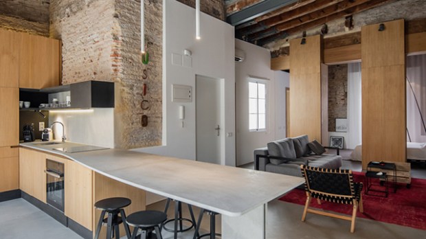 Les spécificités de l’original sont ici sublimées par des espaces fluides qui facilitent un style de vie contemporain. Pour ce faire les architectes ont utilisés des cloisons pivotantes qui permettent de configurer l’espace selon le moment de la journée. Totalement ouvertes, elle favorisent la circulation lumineuse et accentuent l’impression de profondeur. Fermées, elle permettent l’intimité des occupants. La séparation entre les zones de nuit et de jour est marquée par deux éléments verticaux en chêne, semblables à des colonnes, dissimulant de grands placards et qui intègrent trois séries de portes qui permettent de générer les différents niveaux d’intimité.